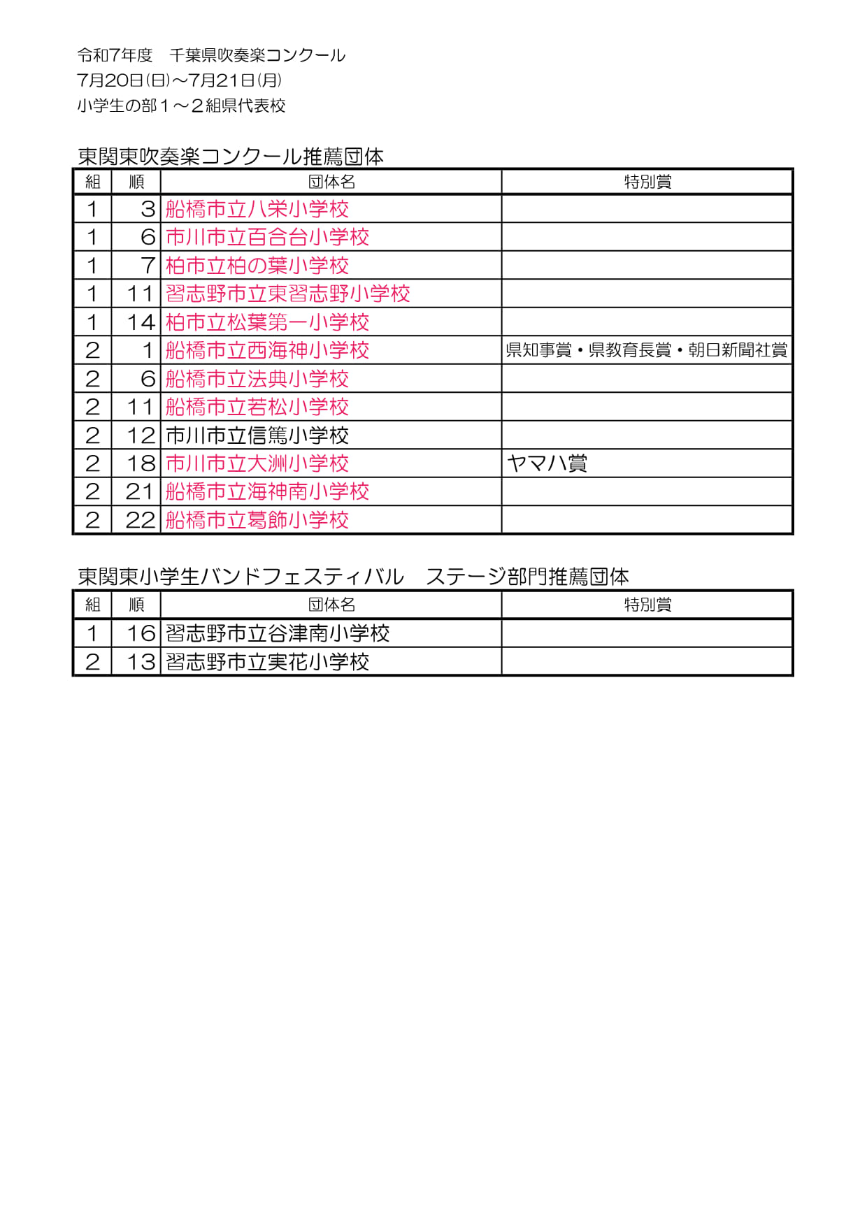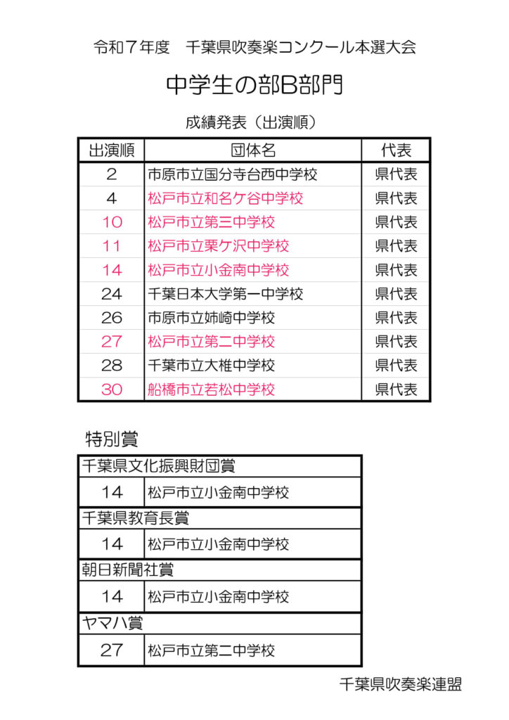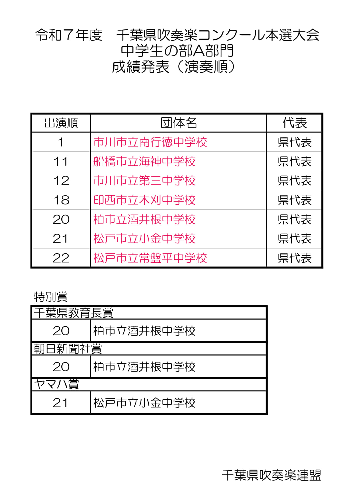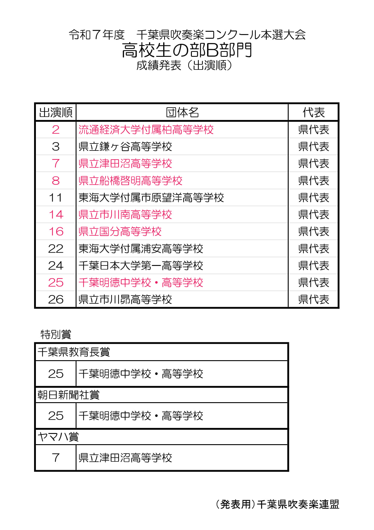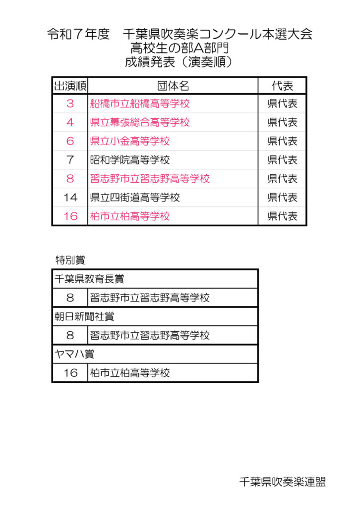2025年7月19日~8月3日(予選会)、8月6日~9日(本選会)に開催されました千葉県吹奏楽コンクールの結果についてお知らせいたします。
