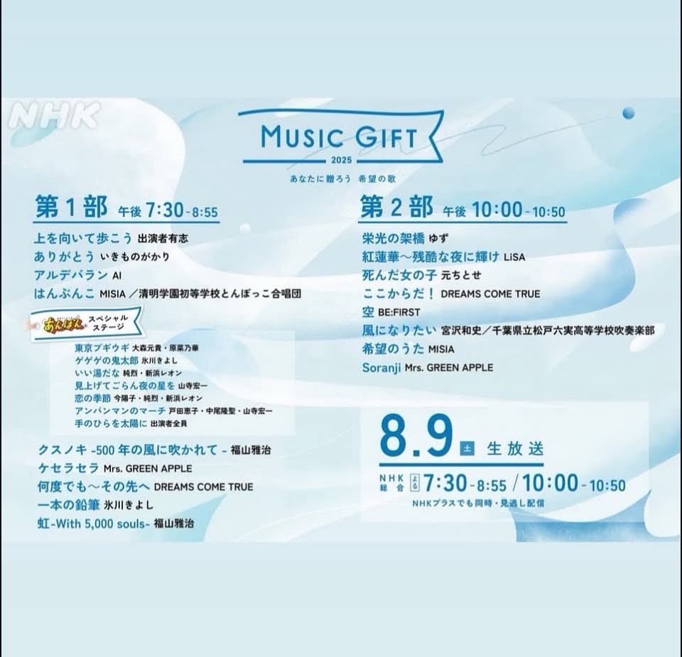 NHK総合「MUSIC GIFT 2025 ~あなたに贈ろう 希望の歌~」に出演します。